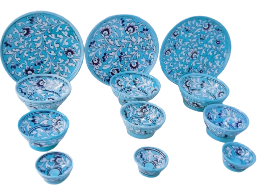 Handcrafted Blue Pottery plates and bowls set, blending utility with artistic charm.