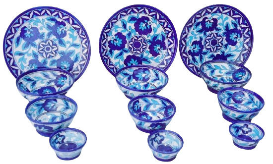 Elegant Blue Pottery set of 3 plates and 9 bowls, perfect for premium dining collections..