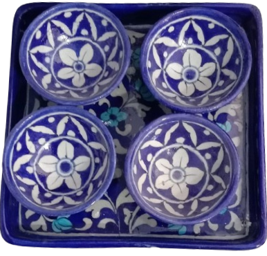 Charming Blue Pottery set with 1 plate and 3 bowls, crafted for elegance and versatility.